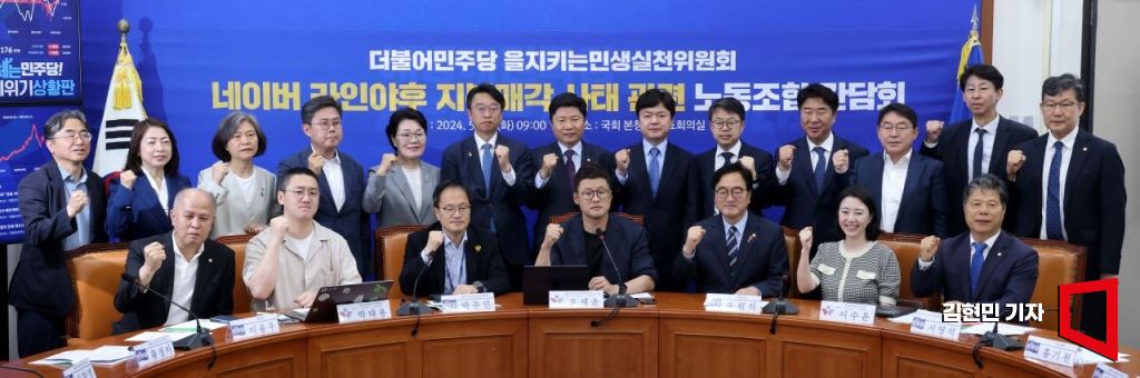 더불어민주당 을지로위(을 지키기 민생실천위원회의) 박주민 위원장과 우원식 의원 등 위원들이 21일 국회에서 라인 사태와 관련해 오세윤 네이버노동조합 위원장 등 조합원들과의 간담회에서 기념촬영을 하고 있다. 사진=김현민 기자 kimhyun81@