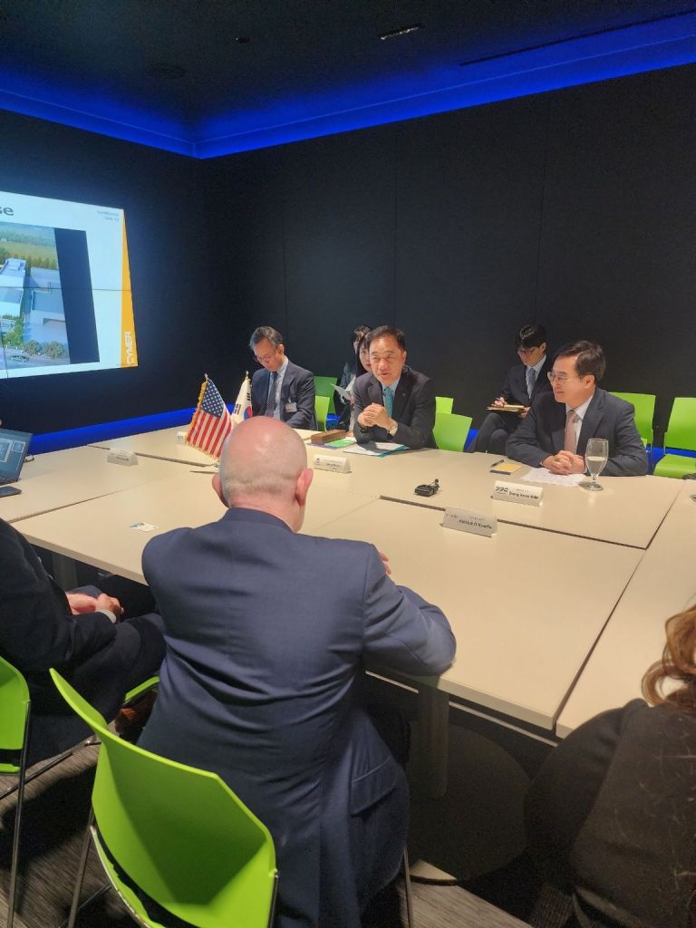 미국을 방문한 정장선 평택시장(가운데), 김동연 경기도지사(오른쪽)이 미국의 한 반도체 기업을 방문해 투자계획을 논의하고 있다. [사진제공=평택시]