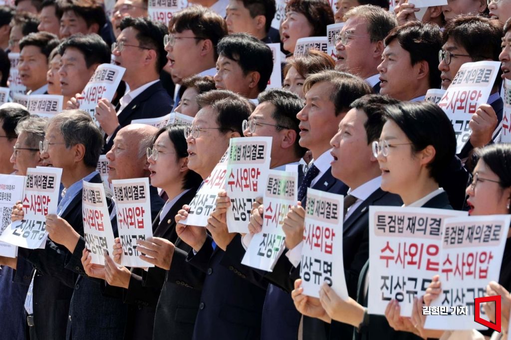 이재명 더불어민주당 대표와 조국 조국혁신당 대표 등 야당 의원들이 21일 국회에서 '채상병 특검법' 재의요구 규탄 야당·시민사회 공동기자회견을 하고 있다. 정부는 이날 한덕수 국무총리 주재로 열린 국무회의에서 '해병대 채상병 사망 사건 수사 외압 의혹 특별검사법'에 대한 재의요구안을 의결했다. 사진=김현민 기자 kimhyun81@