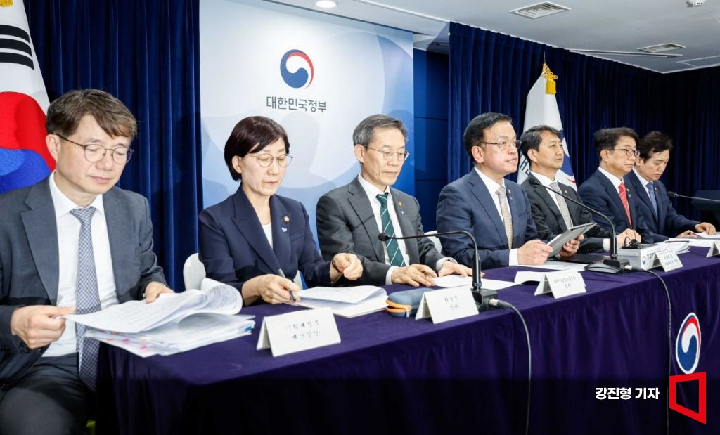 최상목 경제부총리 겸 기획재정부 장관이 23일 서울 종로구 정부서울청사에서 '반도체 생태계 종합지원 방안' 브리핑을 하고 있다. 왼쪽부터 김동일 기획재정부 예산실장, 한화진 환경부 장관, 이종호 과학기술정보통신부 장관, 최 부총리, 안덕근 산업통상자원부 장관, 박상우 국토교통부 장관, 김주현 금융위원회 위원장.