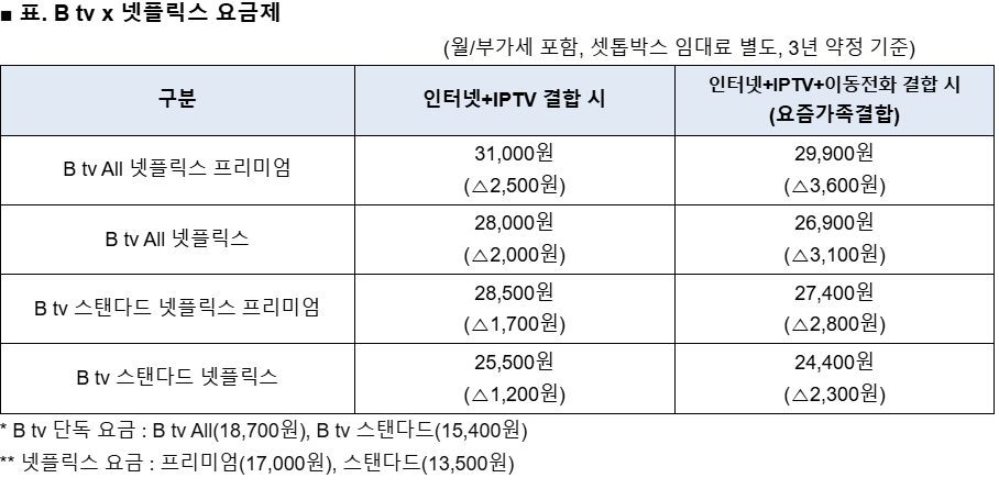 이번에 출시하는 요금제는 인터넷과 IPTV 결합 및 3년 약정 기준으로 ▲B tv All 넷플릭스 프리미엄(월 3만1000원) ▲B tv All 넷플릭스(월 2만8000원) ▲B tv 스탠다드 넷플릭스 프리미엄(월 2만8500원) ▲B tv 스탠다드 넷플릭스(월 2만5500원) 등 총 4종이다.