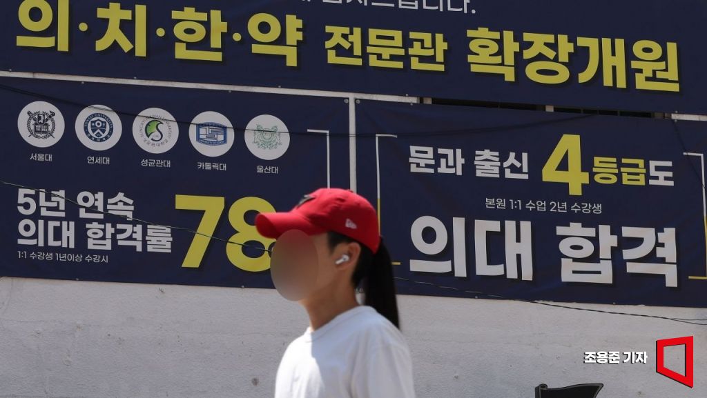 27년만에 의대 입학정원 증원이 확정되면서 의대 합격 문턱이 낮아질 수 있다는 기대감에 학원가가 들썩이고 있다. 31일 서울 강남의 한 학원 건물에 의대 입시 관련 홍보물이 붙어 있다. 사진=조용준 기자 jun21@