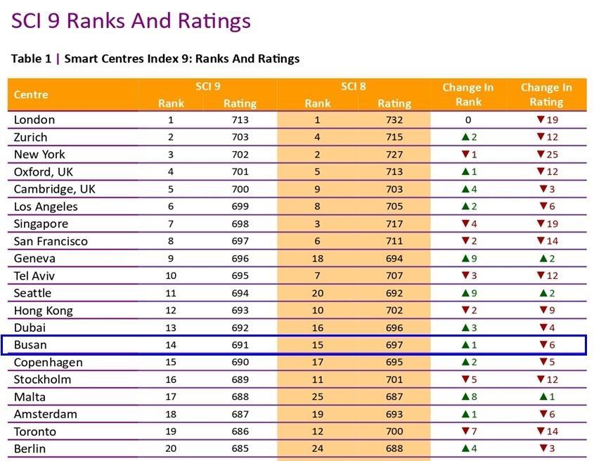 시는 영국의 글로벌 컨설팅 전문기관 지옌사(Z/YEN社)가 발표한 세계 지능형센터지수(글로벌 스마트센터지수, SCI : Smat Centres Index) 9회차 평가에서, 부산이 전 세계 주요 도시 79곳 가운데 14위에 올랐다고 전했다.