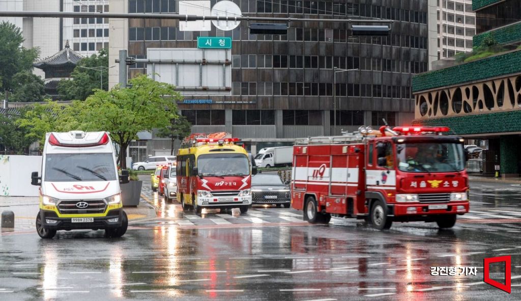 지난 8월23일 서울 중구 서울시청 일대에서 열린 '공습 대비 민방위 훈련'에서 소방차 길터주기가 진행되고 있다. 사진=강진형 기자aymsdream@