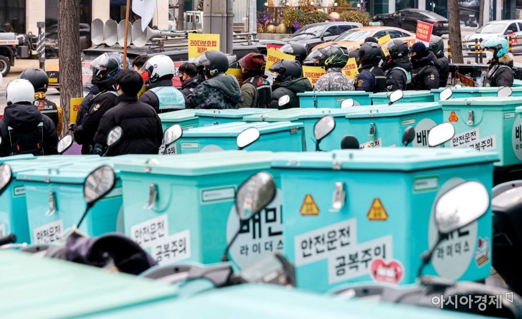 배달노동자들이 배달의민족 라이더 안전배달료 도입을 촉구하는 기자회견을 하고 있다. [사진=강진형 기자aymsdream@]
