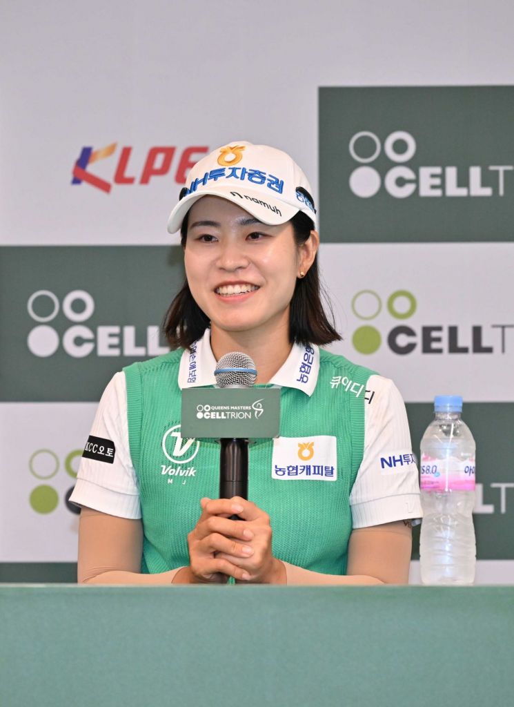 박민지가 셀트리온 퀸즈 마즈터즈 1라운드를 마친 뒤 인터뷰 도중 환하게 웃고 있다.[사진제공=KLPGA]