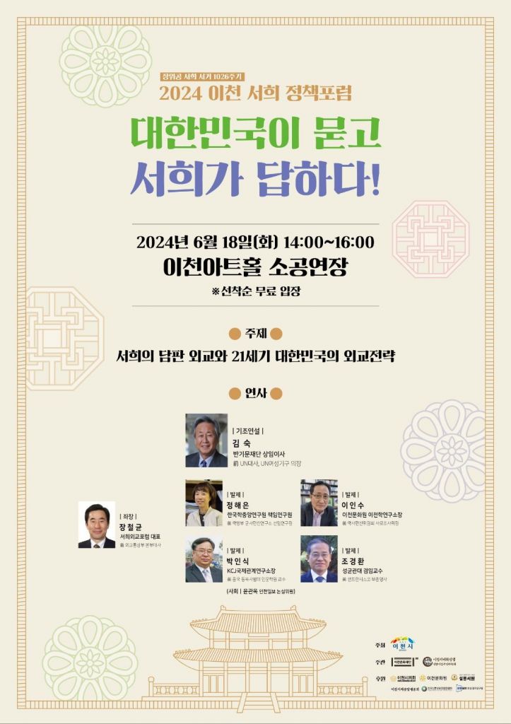경기도 이천시는 오는 18일 이천아트홀 소공연장에서 '2024 이천 서희 정책포럼'을 개최한다.