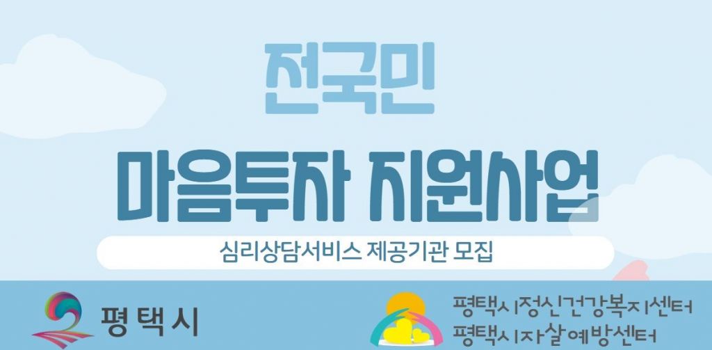 경기도 평택시는 '2024년 전국민 마음투자 지원사업'의 서비스 제공기관을 모집 중이라고 12일 밝혔다.