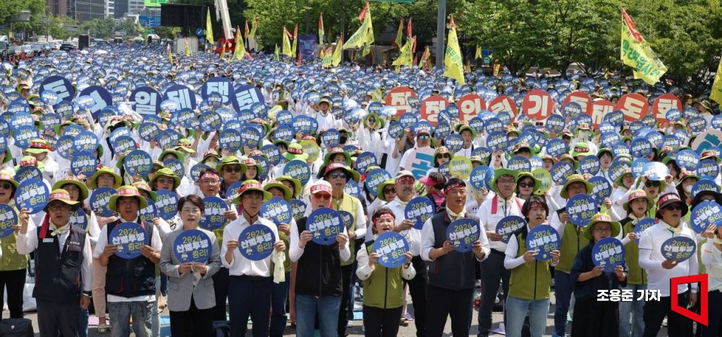 전국보건의료산업노동조합(보건의료조합, 위원장 최희선) 조합원들이 12일 서울 종로구 동화면세점앞에서 총력투쟁 결의대회를 열고 의사들의 조속한 진료 정상화 및 적정인력 기준 제도화, 주4일제, 공공의료 강화 등을 촉구하고 있다. 사진=조용준 기자 jun21@