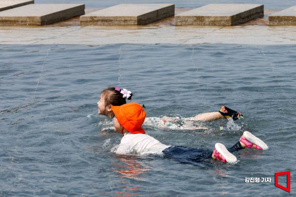 전국 대부분 지역의 낮 기온이 30도 이상으로 오르며 무더위가 기승을 부리고 있는 12일 서울 여의도 한강공원 물빛광장을 찾은 어린이들이 물놀이를 하며 더위를 식히고 있다.