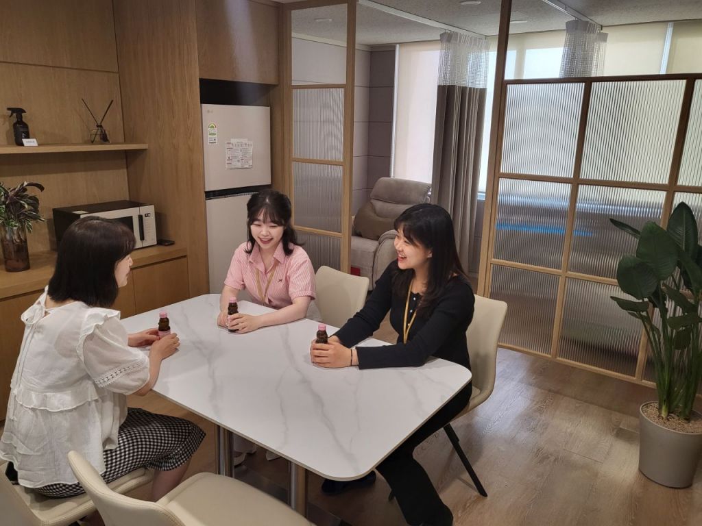 최근 리모델링 공사를 마친 태광산업 여성휴게실에서 직원들이 담소를 나누고 있다. [사진제공=태광그룹]