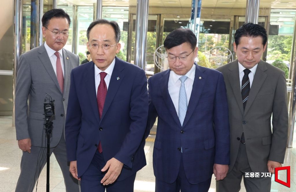 국민의힘 추경호 원내대표를 비롯해 정점식 정책위의장 등이 14일 해병대 채모 상병 순직 사건에 대한 신속한 수사를 촉구하기 위해 경찰청을 방문하고 있다. 사진=조용준 기자 jun21@