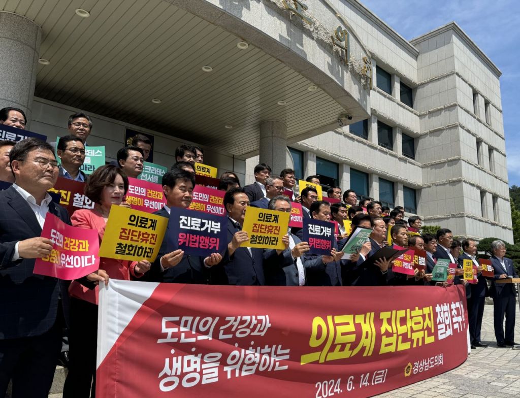 김진부 경남도의회 의장 등 경남도의원 40여명이 14일 도의회 앞에서 의료계 집단휴진 철회를 요청하는 성명을 발표하고 있다. [이미지출처=연합뉴스]