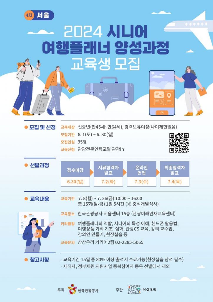 교육 내용은 ‘여행플래너의 역할’, ‘시니어의 특성 이해’, ‘핸드폰 활용법’, ‘여행상품 기획’, ‘강의 교수법’, ‘강의안 만들기’ 등이며 현장 실습도 병행한다.