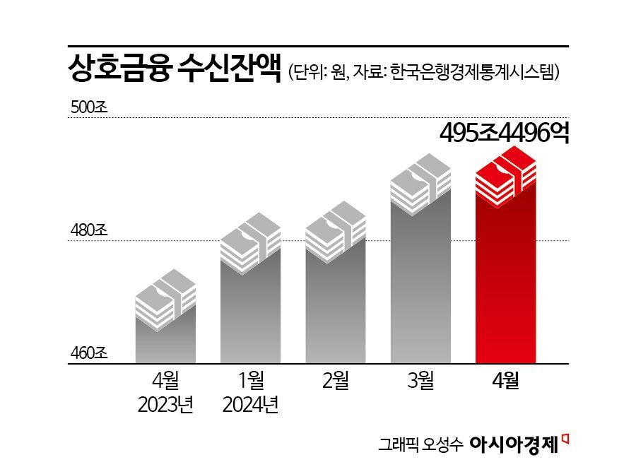 17일 한국은행 경제통계시스템에 따르면 상호금융권의 수신 잔액은 올해 4월 말 기준 495조4496억원으로 집계됐다. 이는 전년 동기 대비 20조881억원이 증가한 수치다. 전월 대비로는 1조2280억원이 늘었다. 상호금융권의 수신 잔액은 1월(484조5078억원), 2월(486조4901억원), 3월(494조2216억원) 등 올해 들어 지속해서 증가하는 흐름이다.