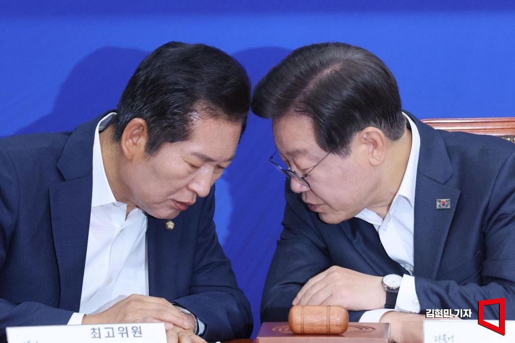 이재명 더불어민주당 대표와 정청래 최고위원이 17일 국회에서 열린 최고위원회의에서 대화하고 있다. 사진=김현민 기자 kimhyun81@