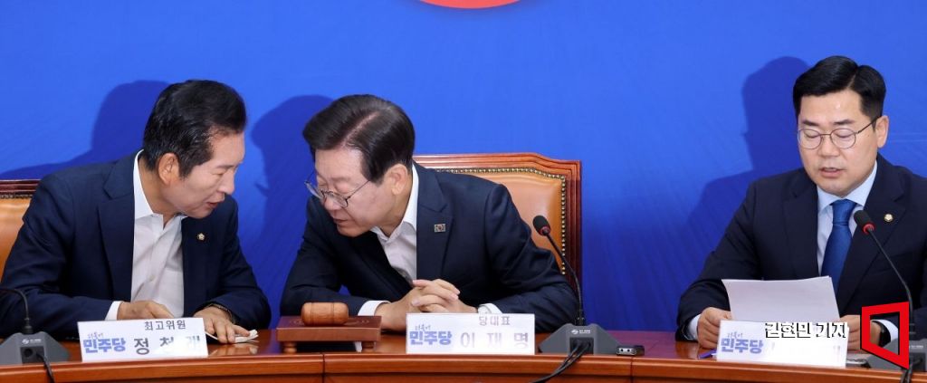 이재명 더불어민주당 대표와 정청래 최고위원이 17일 국회에서 열린 최고위원회의에서 대화하고 있다. 사진=김현민 기자 kimhyun81@