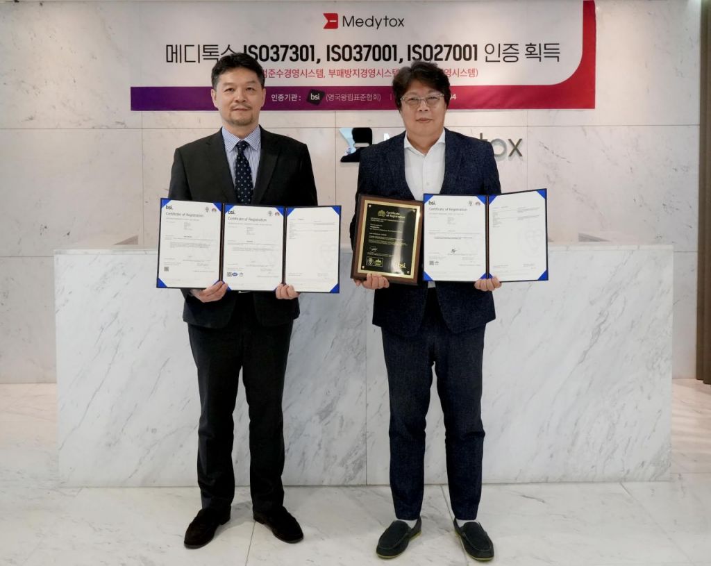 메디톡스는 국제표준화기구(ISO)로부터 규범준수경영시스템인 ISO 37301, 부패방지경영시스템인 ISO 37001, 정보보호경영시스템인 ISO 27001 인증을 획득했다고 17일 밝혔다. 이번 3개의 ISO 인증 추가로 메디톡스는 총 6개의 국제인증을 보유하게 됐다.