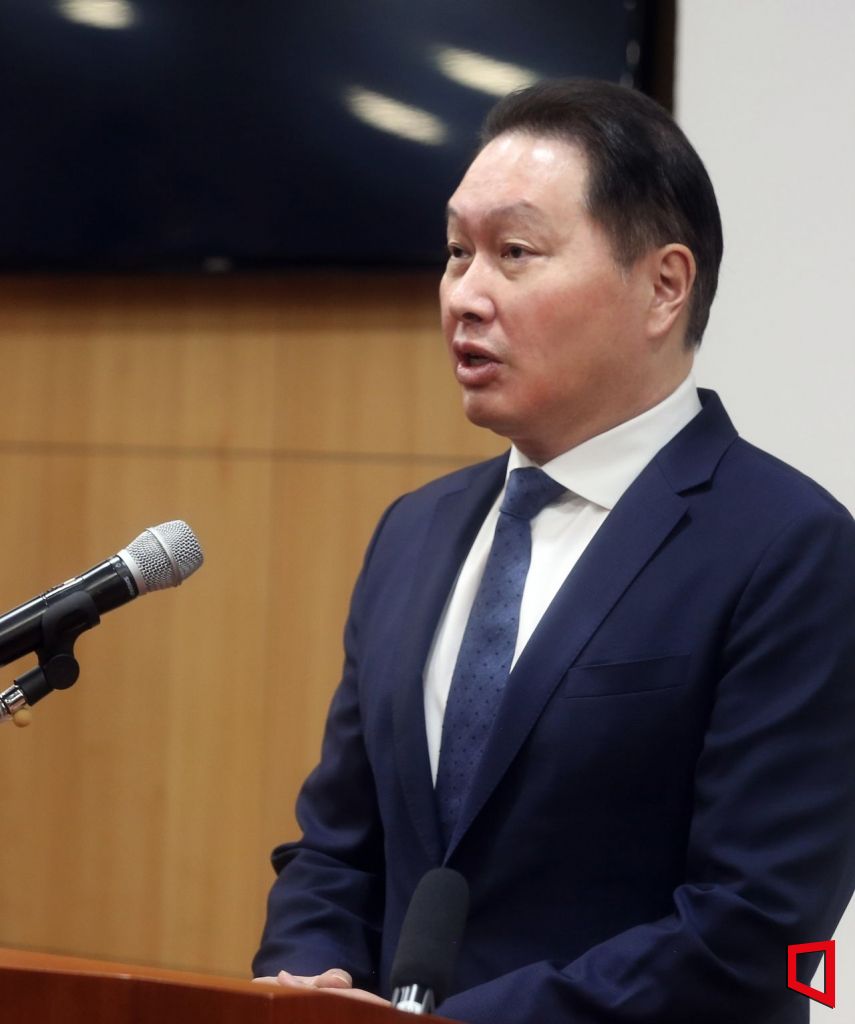 최태원 SK그룹 회장이 17일 서울 종로구 SK서린빌딩에서 최근 재판 현안과 관련해 입장을 밝히고 있다. [사진제공=SK]