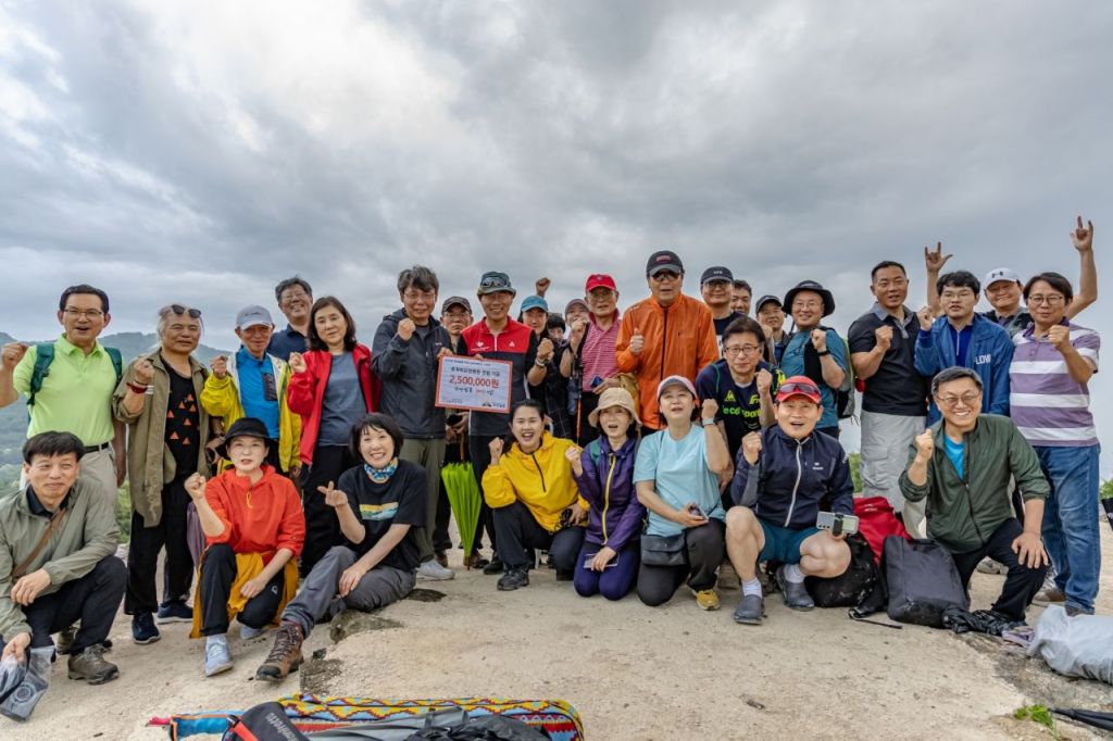 희망일출 산악회 회원들이 300회 일출을 맞아 루게릭 요양병원 건립 후원 성금을 전달하는 모습. [사진제공 = 강희갑 작가]