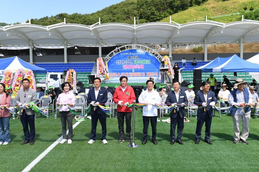 정종복 군수(우측 4번째)와 정동만 국회의원(우측 5번째) 등이 참석한 가운데 개장행사를 진행하고 있는 ‘정관스포츠힐링파크’.