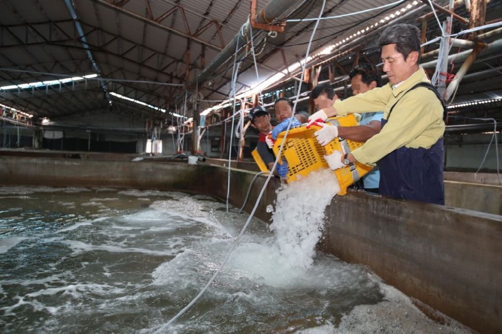 과거 폭염 당시 양식장을 찾아 수온이 높아지는 것을 막기 위해 얼음을 넣고 있는 이강덕 포항시장.