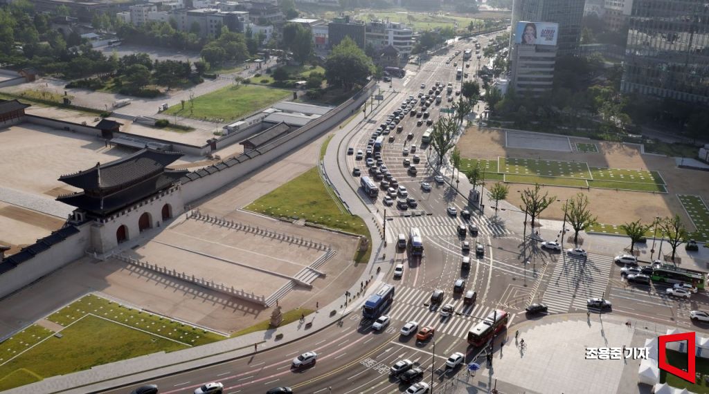 서울 광화문 앞 동편 첫째 자리를 차지했던 조선시대 최고 행정기관 의정부 터(사진 오른쪽)가 시민의 품으로 돌아온 18일 서울 종로 광화문 인근에서 바라본 의정부 터 주변으로 시민들이 출근길에 나서고 있다. 이날 시범개장으로 시작으로 7월 중순 정식 개장할 예정이다. 사진=조용준 기자 jun21@
