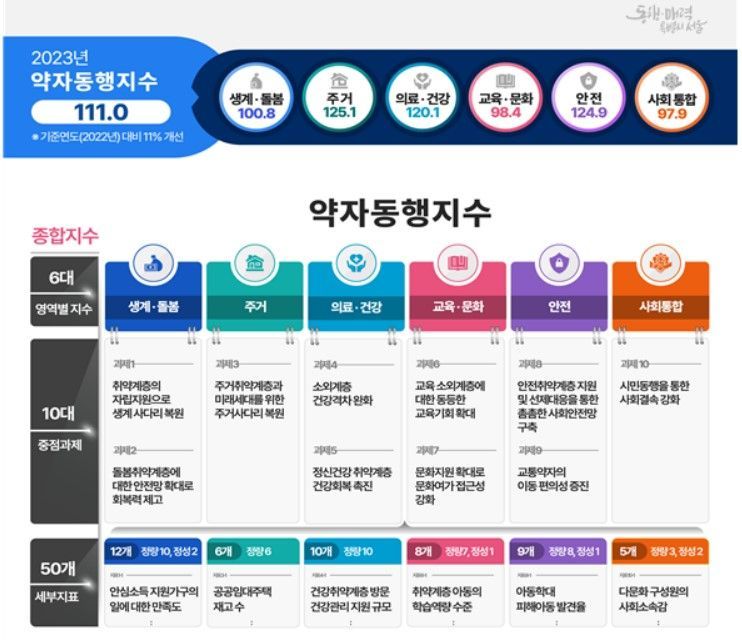 민선 8기 서울시정 핵심 철학인 '약자와의 동행'이 시민들에게 얼마나 도움이 됐는지를 수치로 확인할 수 있는 '약자동행지수' 첫 평가 결과가 나왔다. 2022년 기준연도를 100으로 봤을 때 지난해 전체 지수는 111로 11% 상승했고, 특히 주거와 안전 분야에서 정책 실효성이 높았던 것으로 나타났다.