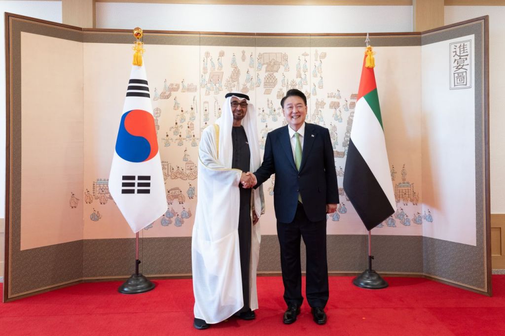 윤석열 대통령이 지난달 29일 서울 용산 대통령실 청사에서 국빈으로 방한한 무함마드 빈 자이드 알 나하얀 아랍에미리트(UAE) 대통령과 악수하며 기념 촬영을 하고 있다. [사진 제공=연합뉴스]