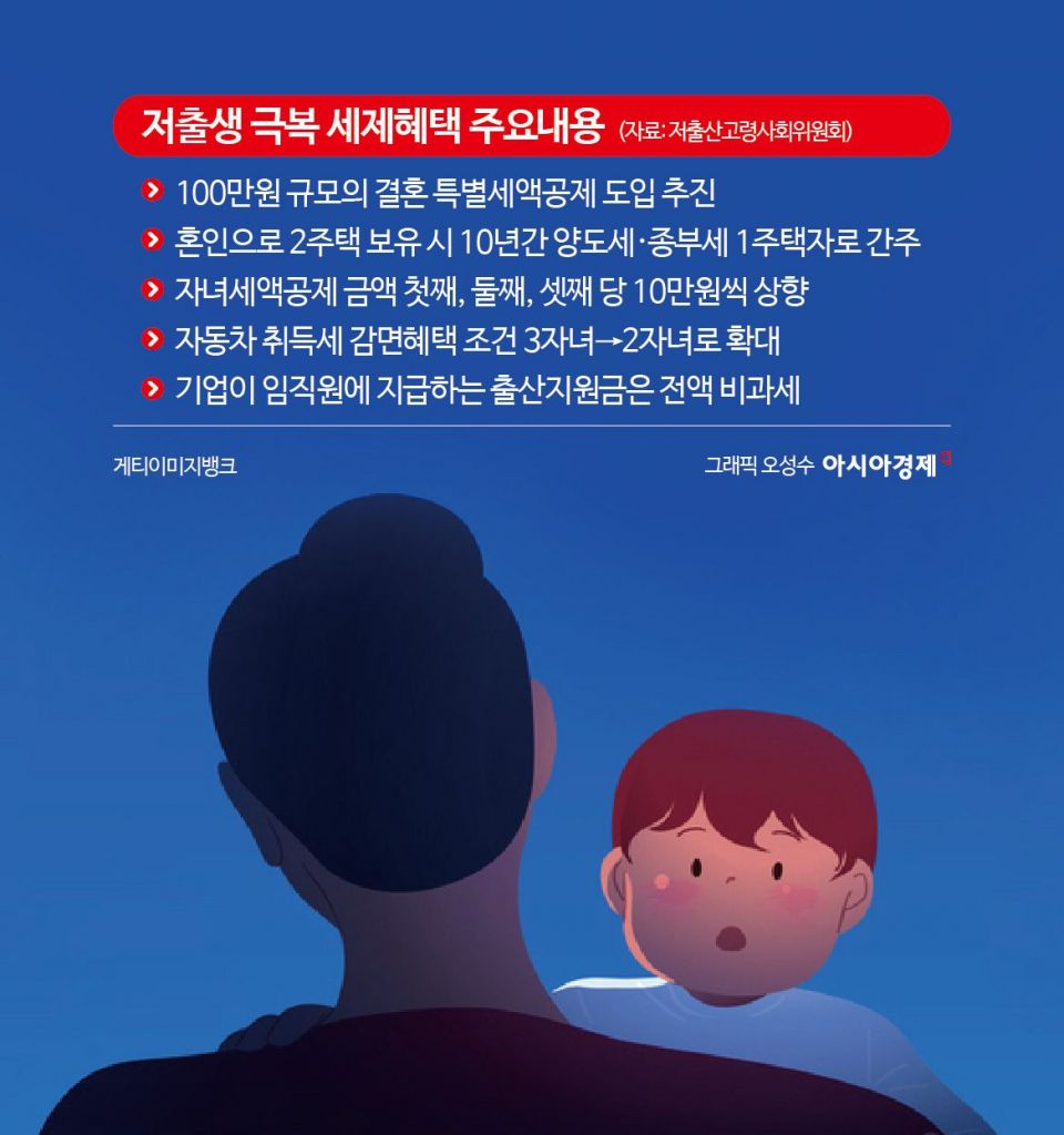 정부가 결혼하면 100만원 규모의 특별세액공제를 지급한다. 양도소득세와 종합부동산세, 자동차세 등도 혼인·출산 가구가 더 유리한 방향으로 개편된다.