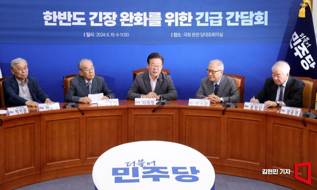이재명 더불어민주당 대표가 19일 국회에서 열린 한반도 긴장 완화를 위한 긴급 간담회에서 발언하고 있다. 왼쪽부터 이종석·임동원 통일부 장관, 이 대표, 정세현 전 통일부 장관, 문정인 전 통일외교안보 특보. 사진=김현민 기자 kimhyun81@