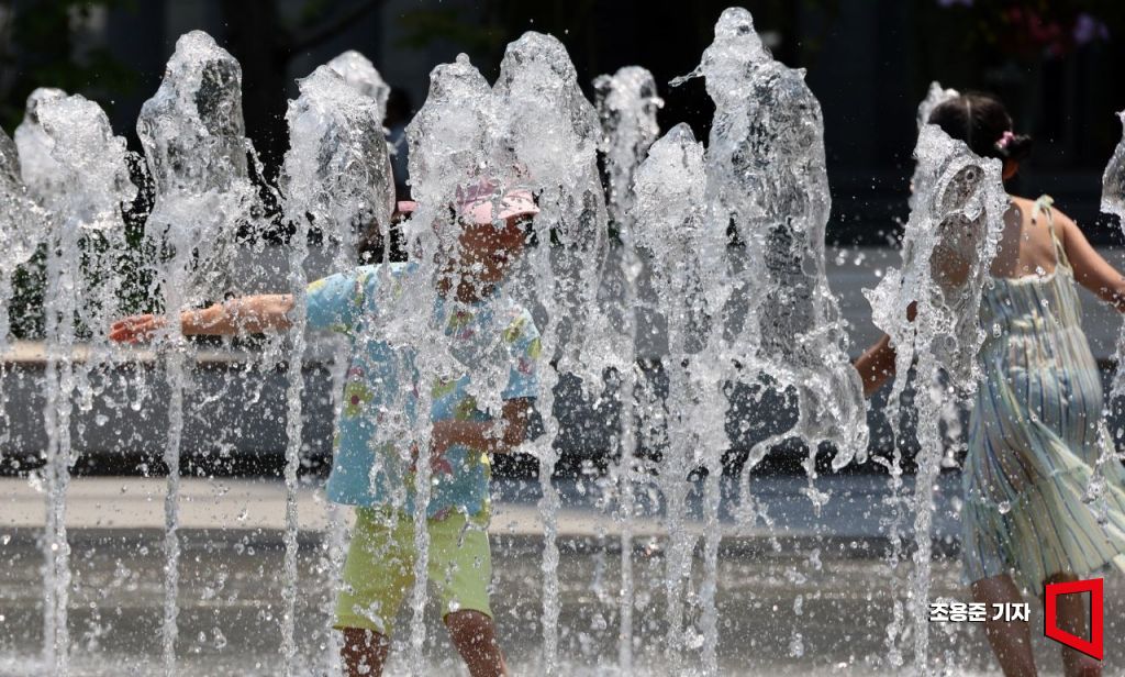 서울 경기 등 중부지방에 폭염주의보가 발효된 19일 서울 낮기온이 35도까지 올라가자 광화문 광장 분수대를 찾은 아이들이 물놀이를 하며 더위를 식이고 있다. 기상청은 이날 늦은 밤부터 제주도에는 장마가 시작될것으로 예보했다. 사진=조용준 기자 jun21@