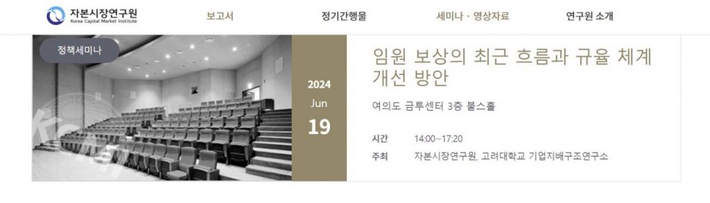 자본시장연구원은 19일 서울 여의도 금융투자협회에서 고려대학교, 기업지배구조연구소와 함께 '임원 보상의 최근 흐름과 규율 체계 개선 방안' 세미나를 열고 이같은 내용을 논의했다. 세미나는 신재용 서울대학교 경영학과 교수, 황현영 자본시장연구원 연구위원, 이창민 한양대학교 경영학부 교수가 주제 발표를 했다.