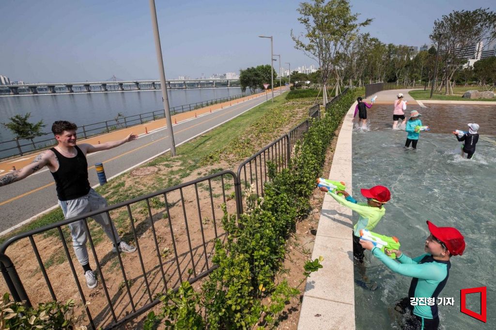 서울에 올여름 첫 폭염주의보가 발령된 19일 서울 송파구 잠실 한강공원 자연형 물놀이장을 찾은 어린이들이 더위에 지친 외국인의 요청으로 물총을 쏘고 있다.