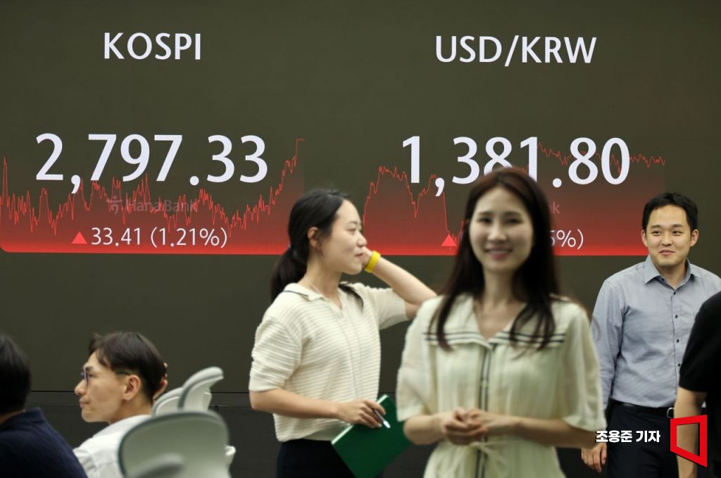 코스피가 미국증시의 강세에 힘입어 2년 5개월 만에 2,790선을 넘어서며 연고점을 경신한 19일 서울 중구 하나은행 본점 딜링룸에 직원들이 업무를 보고 있다. 이날 코스피는 33.41포인트(1.21%) 오른 2,797.33으로 거래를 마감했다. 이는 마감가 기준 지난 2022년 1월 21일(2,834.29) 이후 2년 5개월 만의 최고치다. 사진=조용준 기자 jun21@