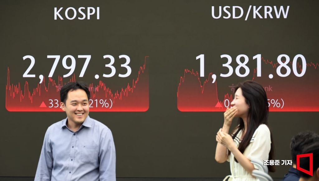 코스피가 미국증시의 강세에 힘입어 2년 5개월 만에 2,790선을 넘어서며 연고점을 경신한 19일 서울 중구 하나은행 본점 딜링룸에 직원들이 업무를 보고 있다. 이날 코스피는 33.41포인트(1.21%) 오른 2,797.33으로 거래를 마감했다. 이는 마감가 기준 지난 2022년 1월 21일(2,834.29) 이후 2년 5개월 만의 최고치다. 사진=조용준 기자 jun21@