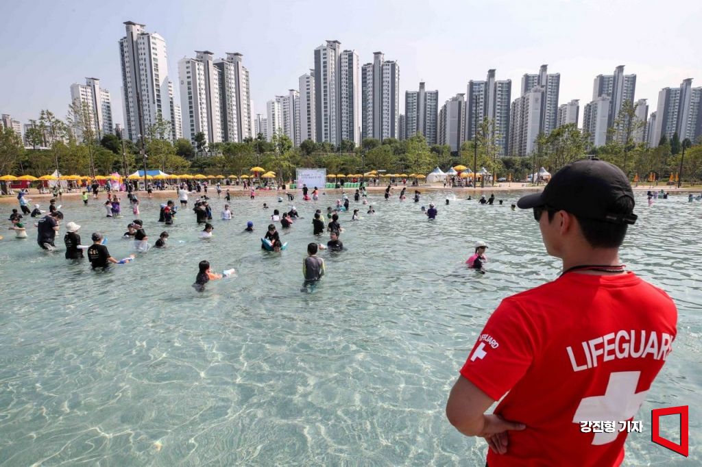서울에 올여름 첫 폭염주의보가 발령된 19일 서울 송파구 잠실 한강공원 자연형 물놀이장을 찾은 어린이들이 물놀이를하며 더위를 식히고 있다.