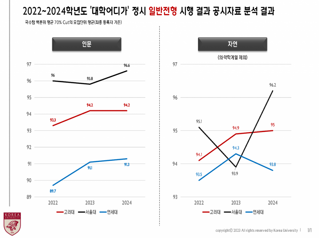 고려대가 ‘대학어디가’ 공시자료를 분석한 결과, 2024학년도 '정시 70% Cut(일반전형, 국어·수학·사회탐구·과학탐구 백분위 평균, 모집단위 평균, 최종등록자 기준)' 기준으로 인문계열은 서울대 96.6, 고려대 94.2, 연세대 91.3 순이었다. 자연계열(의·약학계열 제외)은 서울대 96.2, 고려대 95.0, 연세대 93.8로 확인됐다. 의학계열의 경우에는 고려대, 서울대, 연세대가 99.0으로 동일한 백분위를 보였다.