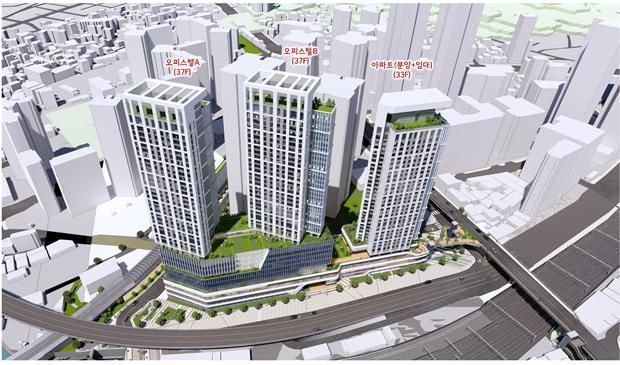 지상 1?3층에는 근린생활시설이 들어선다. 일대 부족한 식음·판매·휴게 기능을 보완했다. 상층부는 공동주택 156세대, 오피스텔 200세대, 업무·판매 시설을 계획했다.