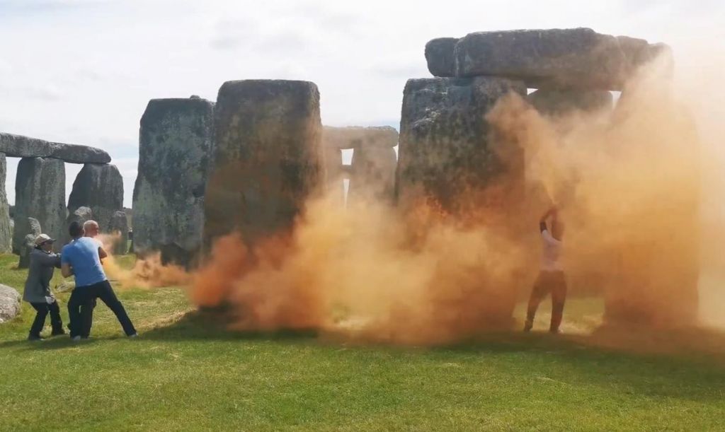 고흐의 작품과 '모나리자'에 수프를 퍼부었던 환경 단체가 이번엔 영국의 고대 유적지 '스톤헨지'에 주황색 물감을 뿌리며 과격 시위를 했다.