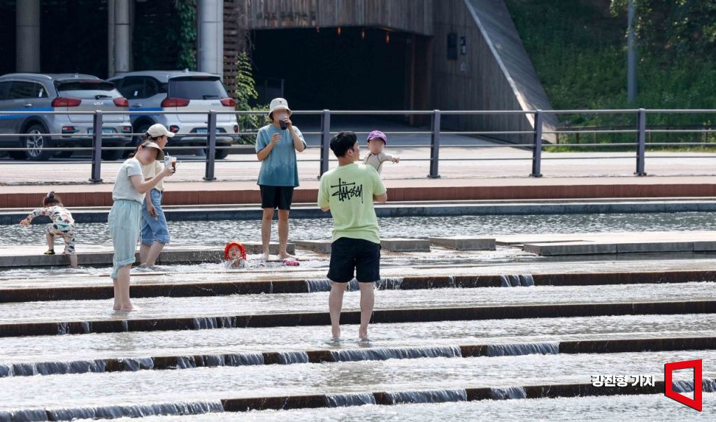 전국 대부분 지역의 낮 기온이 30도 이상으로 오르며 무더위가 기승을 부리고 있는 12일 서울 여의도 한강공원 물빛광장을 찾은 시민들이 물놀이를 하며 더위를 식히고 있다. 사진=강진형 기자aymsdream@