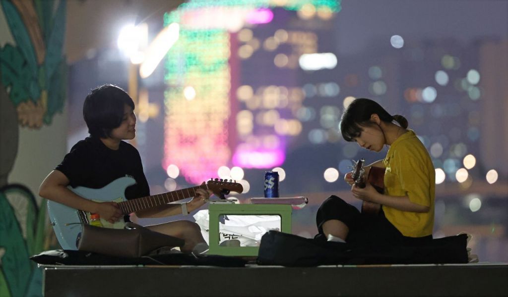 서울 영등포구 여의도한강공원에서 시민들이 기타를 치며 더위를 식히고 있다. [이미지출처=연합뉴스]