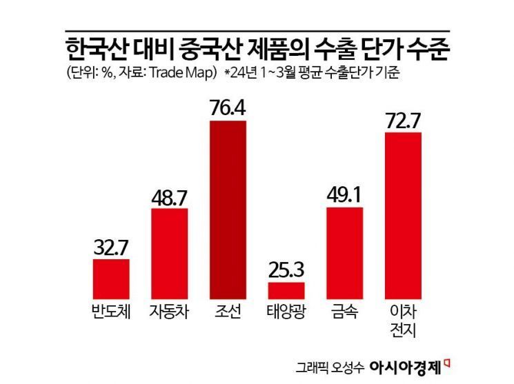 특히 주요 경쟁 품목인 반도체, 자동차, 배터리, 조선, 철강 등의 중국 수출 단가가 한국산의 30~70% 수준에 불과했다. 한국산 대비 중국산 제품의 수출 단가 수준은 태양광은 25.3%, 반도체 32.7%, 자동차 48.7%, 금속 49.1%, 이차전지 72.7%, 조선 76.4% 수준에 불과하다.