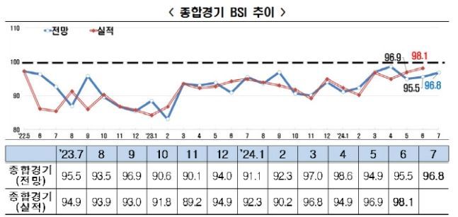 BSI는 기업들이 체감하는 경기 분위기를 지표화한 수치다. 100보다 높으면 경기를 긍정적으로 보는 기업이 더 많다는 의미다. 100보다 낮으면 그 반대다. BSI 전망치는 2022년 4월(99.1)부터 기준선 100을 28개월 연속 하회하고 있다.
