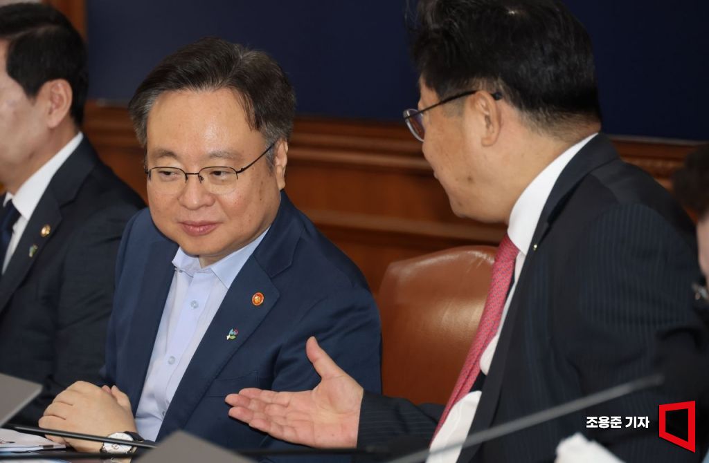 조규홍 보건복지부 장관(왼쪽)이 25일 서울 종로구 정부서울청사에서 열린 국무회의에 참석, 이야기를 나누고 있다. 사진=조용준 기자 jun21@