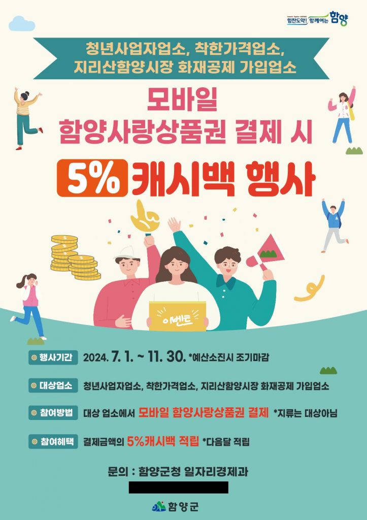 경남 함양군은 지역경제 활성화와 소상공인 경영 부담 완화를 위해 오는 7월 1일부터 모바일 함양사랑상품권 5% 캐시백 지원사업을 실시한다.