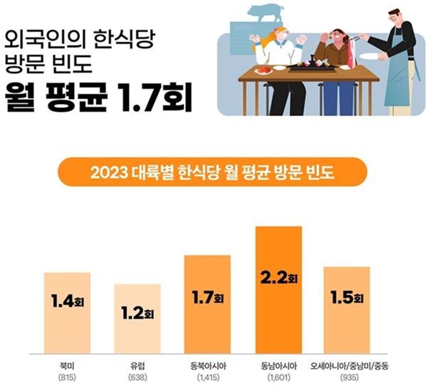 현재 거주하는 도시에서 한식당을 찾기가 쉬운지 묻는 말에 동남아시아 응답자의 79.7%가 쉬웠다고 답했으며, 동북아시아(74.7%), 북미(73.9%), 유럽(61.6%), 오세아니아·중남미·중동(58.7%) 순으로 한식당 방문이 쉬웠다고 응답했다. 외국인의 한식당 방문 빈도는 월평균 1.7회였으며, 대륙별 한식당 월평균 방문 빈도는 동남아시아가 2.2회로 제일 높았다. 그 다음으로 동북아시아 1.7회, 오세아니아·중남미·중동 1.5회, 북미 1.4회, 유럽 1.2회 순이었다.