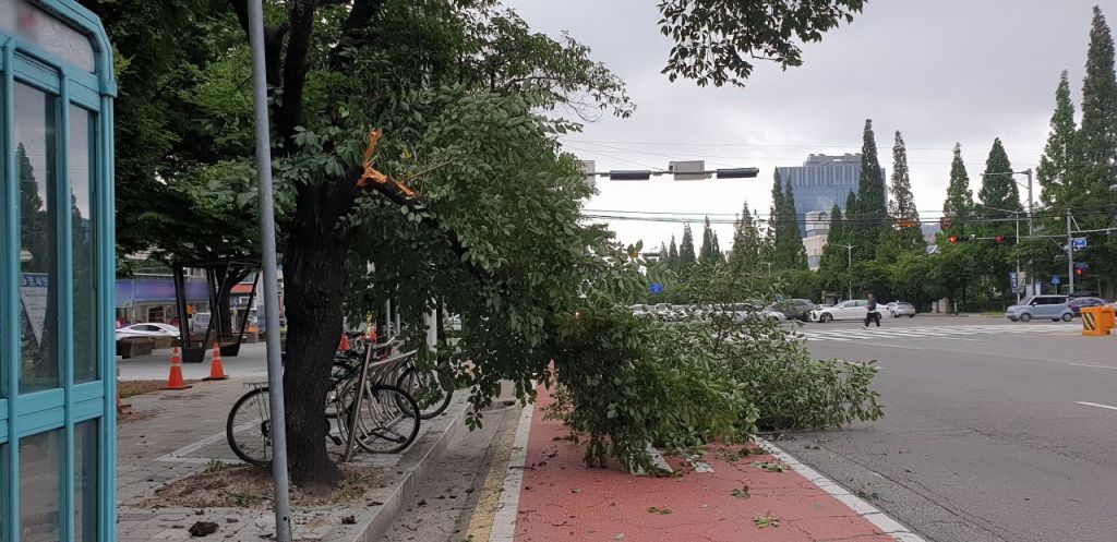 부러진 가지는 1개 차로를 덮었고 나무 파편이 인도와 도로에 흩어져 있었다.