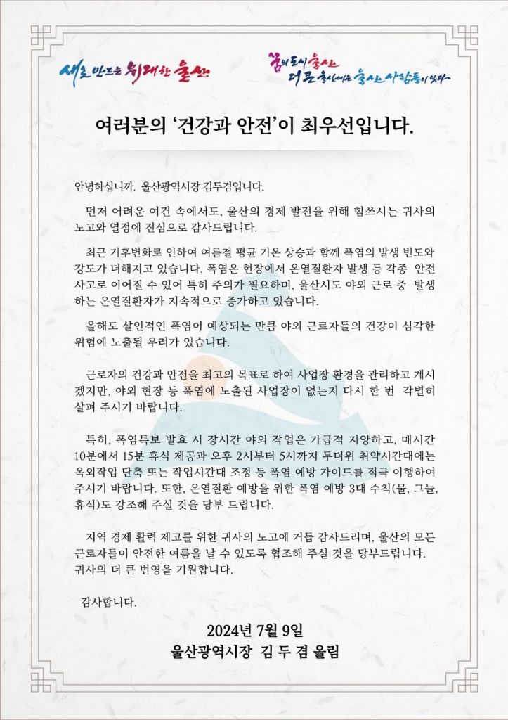 최근 여름철 평균 기온 상승과 함께 폭염 일수가 늘어나고 강도도 강해지고 있어 여름철마다 근로 중에 발생하는 온열질환 예방을 위해 울산지역 근로자의 건강과 안전을 당부하는 내용을 편지가 담고 있다.