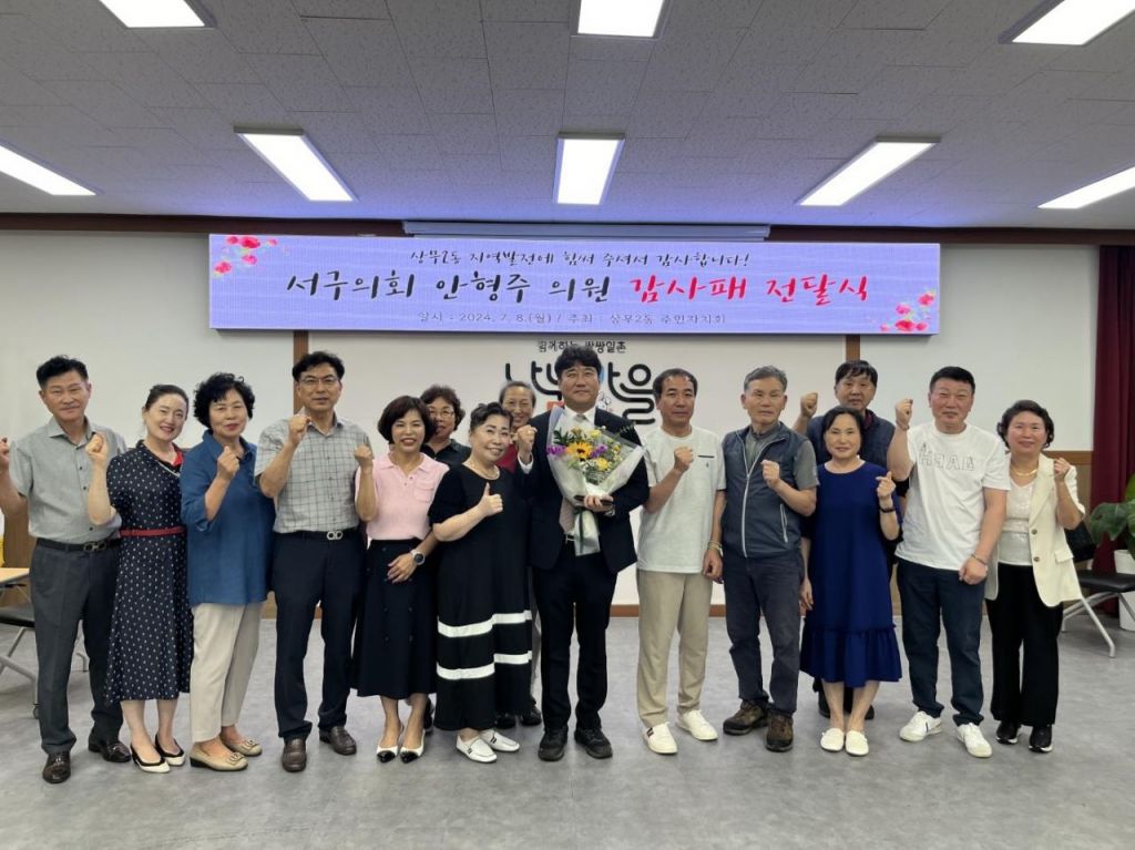 8일 서구의회에 따르면 안 의원의 지역구인 상무2동 주민 일동으로부터 감사패를 전달받았다.